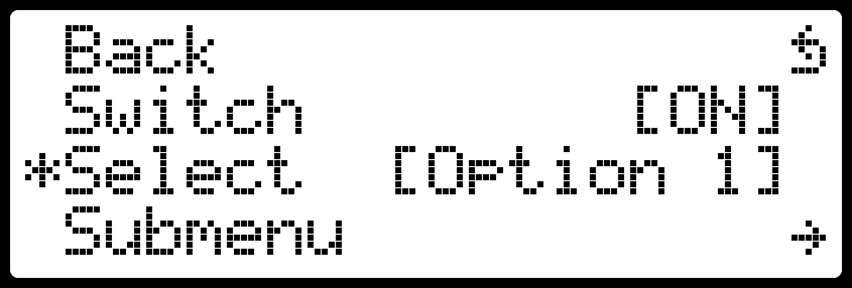 0x2a(*).mark_submenu (Optional, 0-255): Code of the character used to mark menu item leading to a submenu. Defaults to