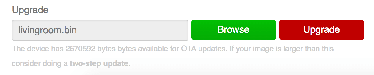 In the “Upgrade” section, choose the binary you previously downloaded and press “Upgrade”. If everything succeeds, you should now have ESPHome on your node 🎉