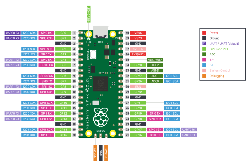 Below is a quick reference for Raspberry Pi RP2xxx boards. If it is your first time working with this board it may be useful to get an overview of the microcontroller: